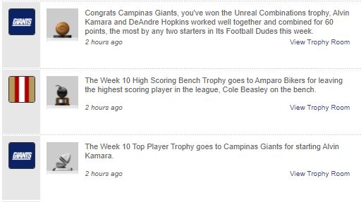 While Davante Adams led Limeira Dead Rabbits with 33.30 points in Week 9, Hines paced the squad this week with 28.50.