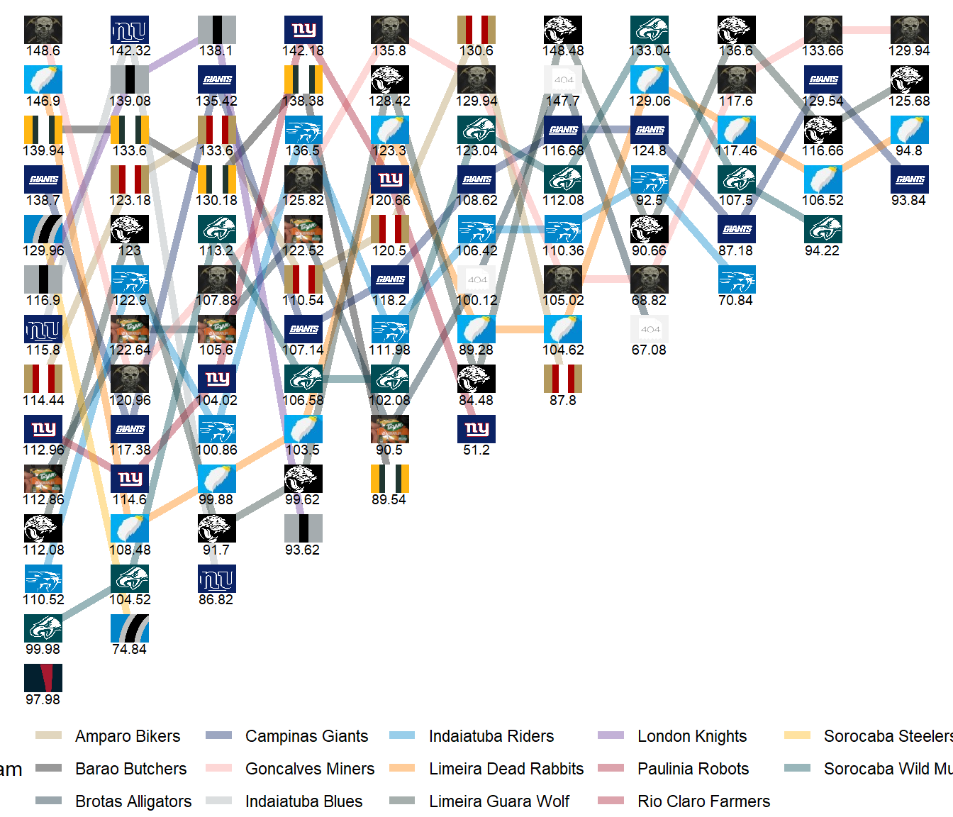 Limeira Dead Rabbits | 7-4-0 | 1223.80 | 1142.76 |