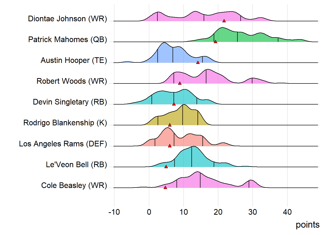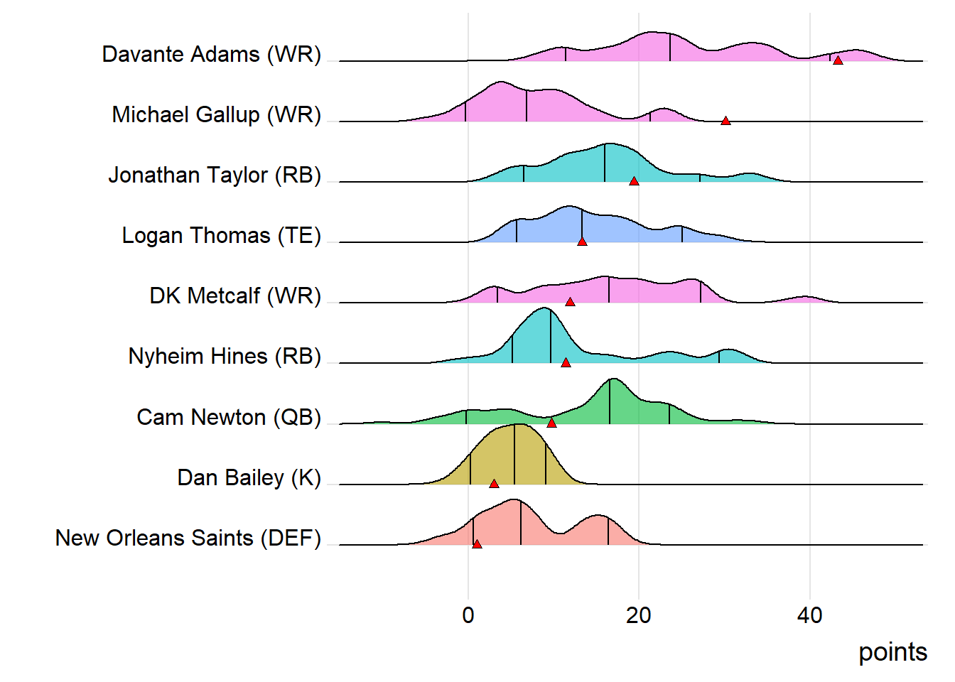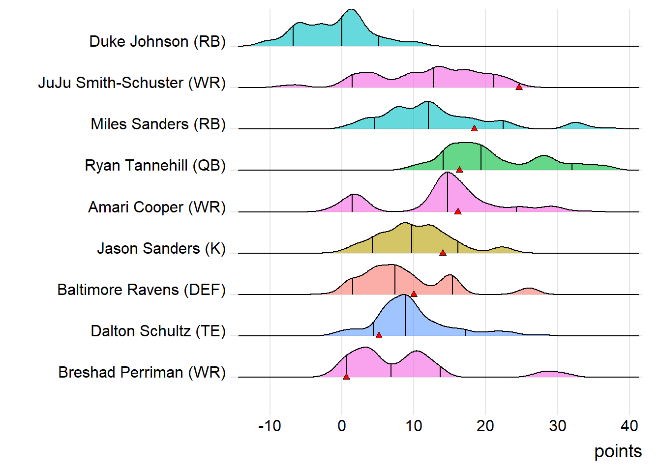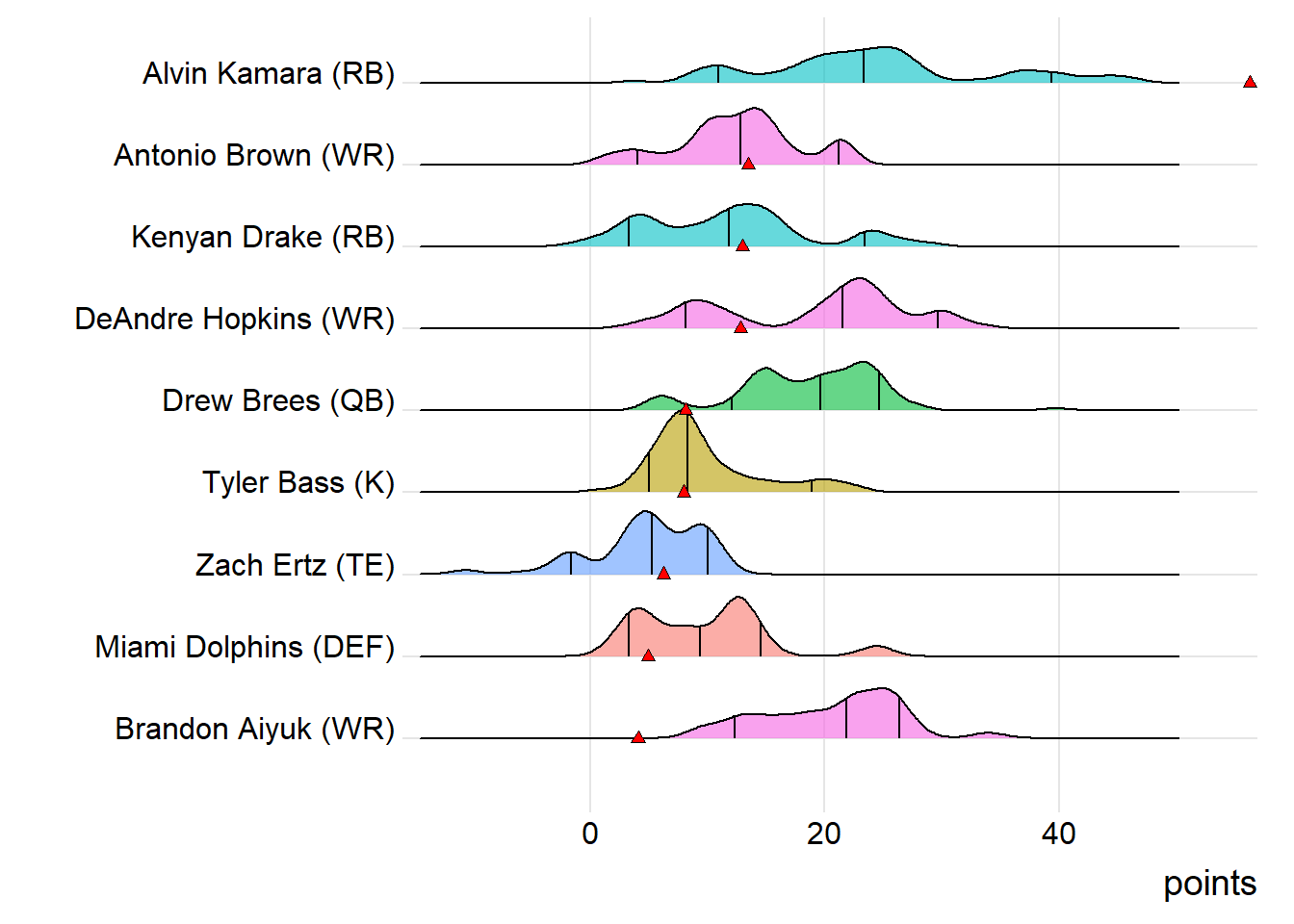 For the winners, two players have been heating up in the postseason : Kamara and Antonio Brown. During the playoffs, that duo has exceeded their season scoring averages by 41% and 31%, respectively. Conversely, Campinas Giants has a player trending the opposite way. Drew Brees has fallen significantly short of his year-to-date average in the postseason by 49%. Rio Claro Farmers had a couple of players who were cooling off in the playoffs: Younghoe Koo and Davis. During the postseason, that combo has averaged 6.00 and 8.47 points, respectively, falling short of their season-long marks by 48% and 44%.