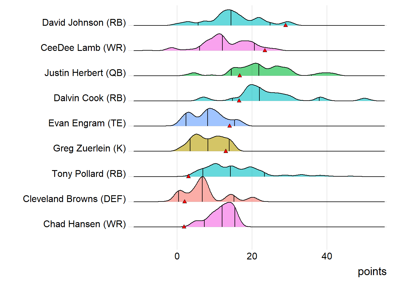 For the winning team, several players have been heating up in the postseason, most notably Michael Gallup and Jonathan Taylor. During the playoffs, that duo has surpassed their season scoring averages by 79% and 66%, respectively. On the other hand, Limeira Dead Rabbits has a pair of players trending in the wrong direction. The New Orleans Saints DEF and Cam Newton have both fallen significantly short of their year-to-date averages during the postseason. Paulinia Robots had a couple of players who were cooling off in the playoffs: Dalvin Cook and Justin Herbert. During the postseason, that combo has averaged 17.75 and 16.22 points, respectively, falling short of their season-long marks by 28% and 26%.