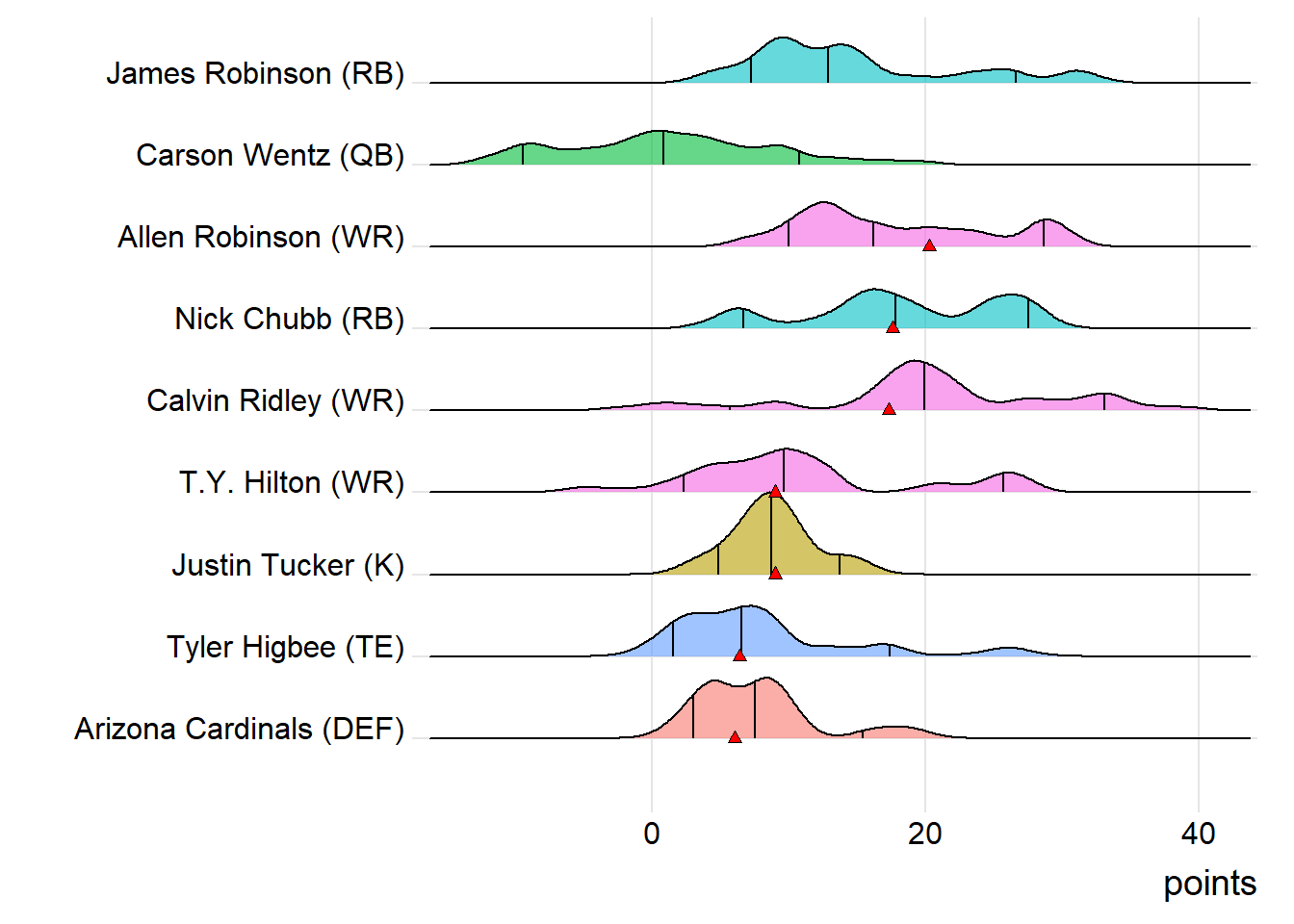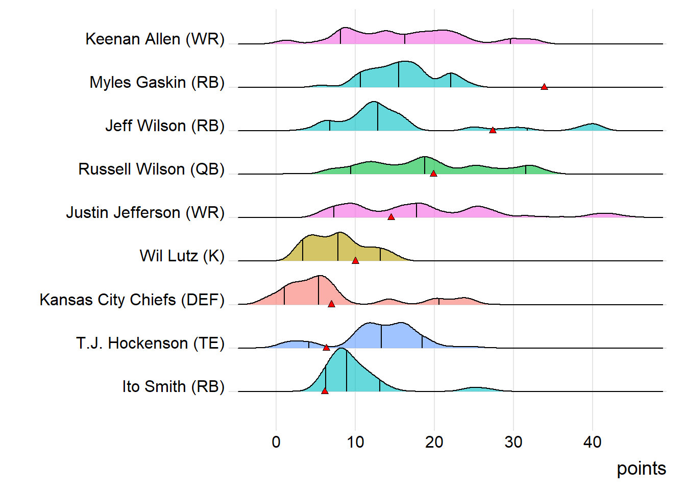 For the victorious side, several players have been late-season stars, most notably J.D. McKissic and Diggs. During the playoffs, that duo has bettered their season scoring averages by 114% and 73%, respectively. On the other hand, Goncalves Miners has a player moving in the wrong direction. Tyreek Hill has fallen significantly short of his year-to-date average in the postseason by 39%. Robbie Gould was cold in the playoffs for Brotas Alligators. After registering 6.79 points per game on the season, he recorded 4.00 per game in the postseason.