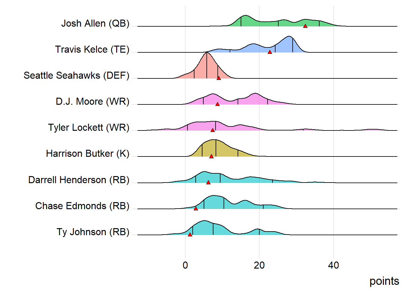 Despite the loss, Limeira Guara Wolf had a few players performing their best in the playoffs, most notably Ty Johnson and the Seattle Seahawks DEF. During the postseason, that combo has averaged 9.40 and 9.00 points, respectively, topping their season-long marks by 59% and 45%. Conversely, the losers had a couple of players who struggled in the playoff spotlight: Darrell Henderson and Tyler Lockett.